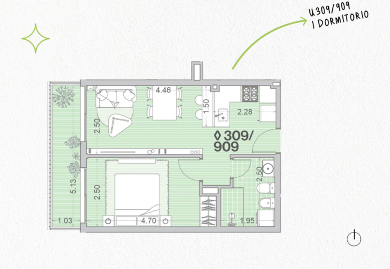 Este moderno apartamento de 1 dormitorio ofrece una distribución funcional, ambientes luminosos y una terraza privada ideal para disfrutar del aire libre.